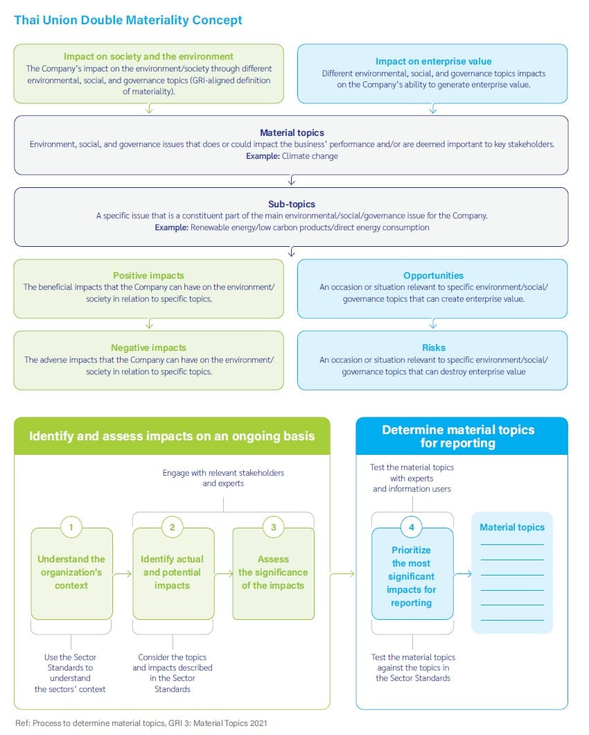 Thai Union undertakes a comprehensive double materiality assessment every two years to identify ESG topics with both business and stakeholder impacts. The materiality process incorporates stakeholder engagement, sector standards, and expert input to prioritize risks and opportunities, spanning environmental, social, and governance dimensions .