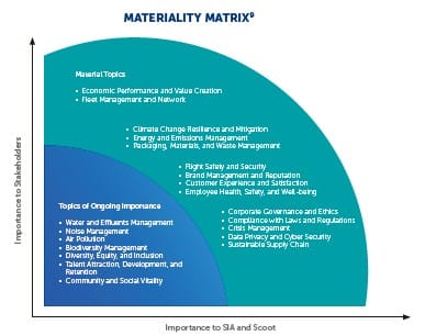 SIA’s materiality process remains stakeholder-driven, but it is also fairly stable. The latest full assessment was performed in 2022 with Scoot included, and FY2024/25 management and the Board committee reaffirmed the continued relevance of 14 material topics. Those topics cover the expected aviation themes—economic performance, fleet management, climate resilience and mitigation, energy and emissions, waste, flight safety, customer experience, employee well-being, governance, cyber security, crisis management, and sustainable supply chain.