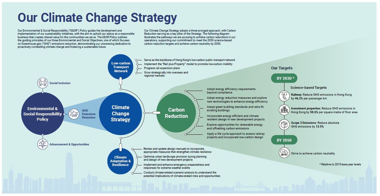 MTR’s ESG strategy is operationalised through three Environmental and Social Objectives (E&SOs): social inclusion, advancement and opportunities, and greenhouse gas emissions reduction, supported by 43 KPIs in 2024 . The company reports that all KPIs are either achieved or on track, suggesting strong internal execution discipline.