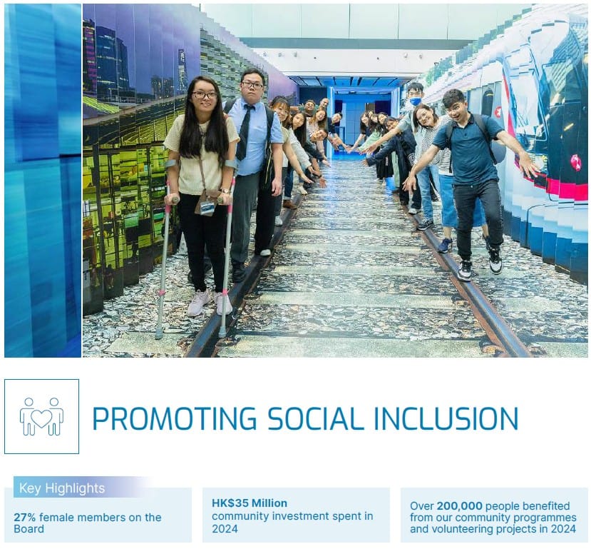 Importantly, the report highlights three structural megatrends—climate resilience, ageing population, and digital transformation—which frame ESG risks and opportunities. This forward-looking lens indicates that MTR is not only responding to current ESG risks but also positioning itself against long-term systemic shifts affecting urban mobility and infrastructure.