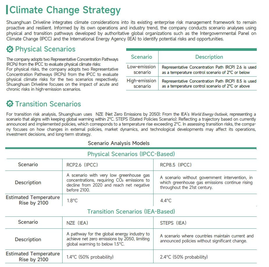Shuanghuan Driveline’s 2024 Sustainability Report reflects measurable carbon intensity reductions, structured governance oversight, and strong integration of digital manufacturing with ESG management. The combination of circular economy metrics, supplier integrity enforcement, and board-level climate governance indicates strategic ESG embedding rather than symbolic disclosure. Continued transparency on Scope 3 supplier emissions and renewable energy scaling will be key markers of long-term climate credibility.
