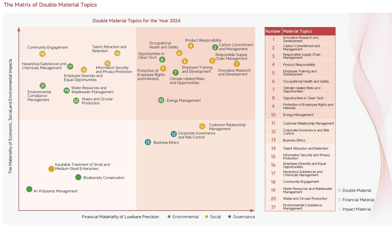 Luxshare has strengthened its three-tier ESG governance model (“Decision-Making – Planning – Execution”), with Board-level oversight and integration of sustainability targets into executive remuneration frameworks. The report outlines a structured double materiality assessment process, identifying 10 double material topics and embedding climate, product responsibility, and supply chain management into enterprise risk management.
