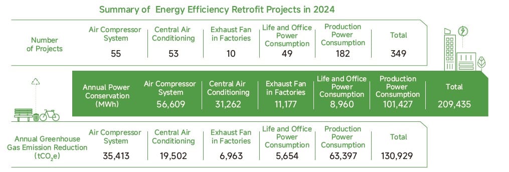Energy efficiency and digitalization are presented as operational levers. Through 349 retrofit projects, the company saved over 209,000 MWh in 2024. The Intelligent Energy Management (IOE) platform and MOM system upgrades illustrate a deeper integration of data-driven manufacturing, with intelligent asset management and predictive maintenance reducing operational losses and strengthening resource optimization.