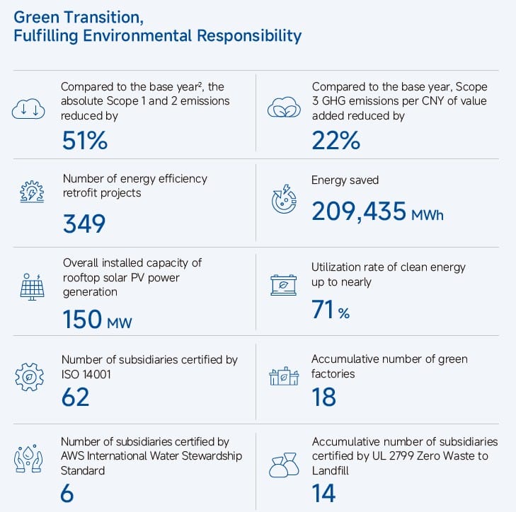 On green products and innovation, Luxshare invested more than RMB 400 million in clean technology R&D, obtaining 50 clean technology-related patents during the reporting period. Its portfolio spans EV powertrains, AI data center interconnects, hydrogen fuel cell stacks, and photovoltaic inverters, positioning the company within high-growth low-carbon sectors.